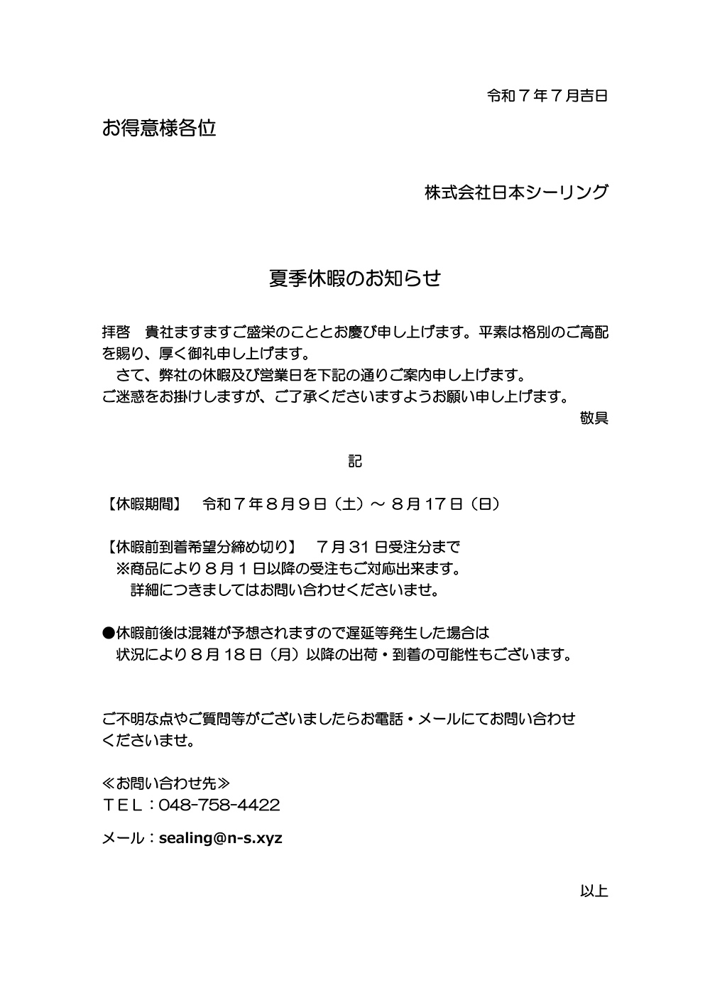 夏季休暇のお知らせ 弊社の夏季休暇を下記の通りご案内申し上げます。 令和7年8月9日(土) ~ 8月17日(日) 休暇前後はご注文・配送の混雑が予想されますので、お早めにご注文いただきますようよろしくお願い申し上げます。