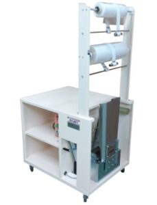 平面包装機で包装作業を行っている間に、次に使用するフィルムを先に巻き取っておき、作業を止めずに効率的に包装作業を行う事が出来ます。使用するフィルムも便利な2本掛け、下に収納場所もあり、キャスター付きでワゴンとしても活用できるため大変便利です。
